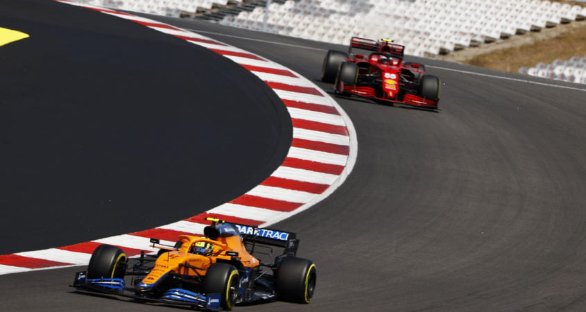 Norris startte in Portugal als zevende, maar bond na een goede start de strijd aan met Red Bulls Sergio Pérez. De Brit slaagde erin de Mexicaan bij de herstart te grazen te nemen in duel om P4. Na iets meer dan een handvol ronden draaide Pérez de rollen echter om, waarna Norris dus weer vijfde lag. Al moest hij er nog hard voor werken.