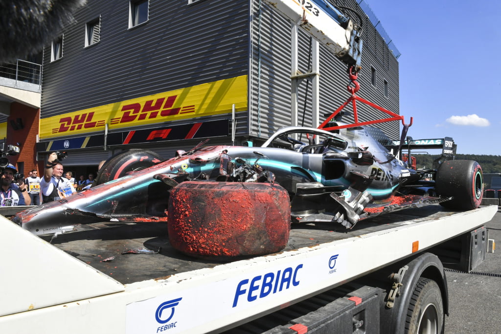 De Mercedes van Lewis Hamilton na zijn crash in VT3 tijdens de Grand Prix van België. Foto: Motorsport Images