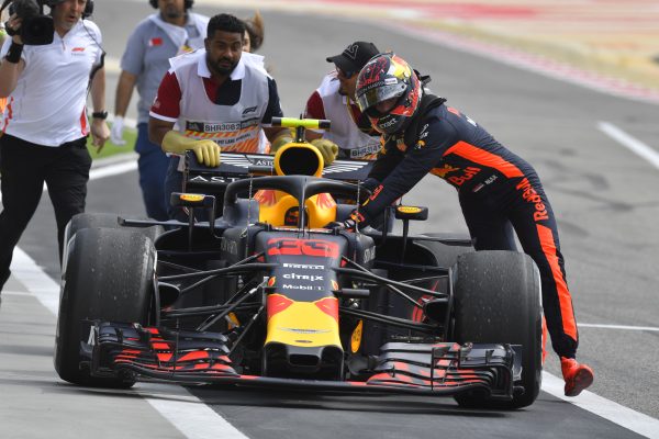 Verstappen en een aantal marshals duwen de Red Bull RB14 nadat deze is stilgevallen terug naar de pits in VT1.